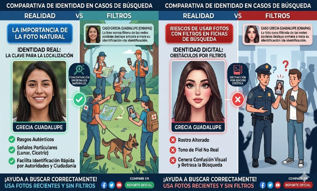 La localización con vida de la joven Grecia Guadalupe Orantes Mendoza en Chiapas ha traído alivio a su familia, pero también ha puesto sobre la mesa un tema crítico para la seguridad ciudadana: cómo el uso de filtros en fotografías de redes sociales puede entorpecer las labores de búsqueda en casos de desaparición.