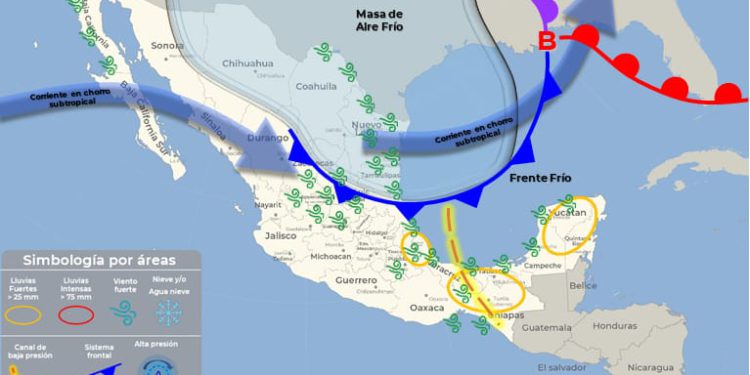 Por otro lado, canal de baja presión sobre en el interior del territorio nacional y la Península de Yucatán, en interacción con la entrada de humedad del mar Caribe, originará lluvias y chubascos que podrán acompañarse de descargas eléctricas en la Península de Yucatán. Finalmente, persistirá el ambiente vespertino de caluroso a muy caluroso.