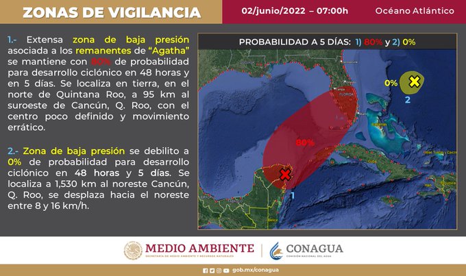 La Coordinación Estatal de Protección Civil (Coeproc) informa que, con base en el Centro Nacional de Huracanes, de Miami, Florida Estados Unidos, y del Servicio Meteorológico Nacional, esta mañana la zona de baja presión, asociada a los remanentes de Agatha, se mantienen con 80 por ciento de probabilidad de evolucionar en un sistema ciclónico a 48 horas y cinco días, se localiza en tierra, al norte de Quintana Roo, aproximadamente a 95 kilómetros al suroeste de Cancún, con el centro poco definido y movimiento errático.Su presencia provocará Lluvias en gran parte del Estado durante las próximas 24 o 48 horas.