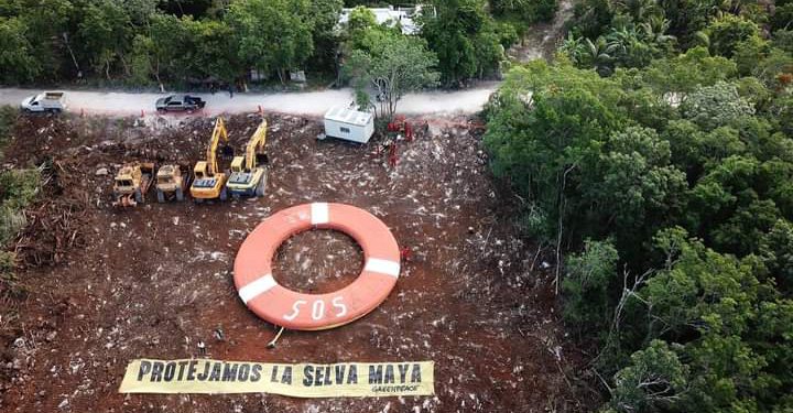 Activistas y ambientalistas de la organización Greenpeace protestaron este lunes en contra de la reanudación de las obras del Tramo 5 Sur del Tren Maya.