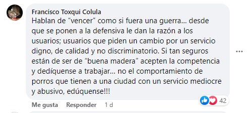 Pero ahora con la entrada de una opción de transporte que pueda entregar a sus clientes un servicio de calidad y confianza, Luis Herrera sufre el efecto “Shakira” ya que señala que ellos “no lloran, ellos facturan”, pero basándose en la realidad, ¿Qué tan cierto es eso? ¿Alguna vez se le ha permitido a un cliente facturar algún servicio brindado? ¿Está permitido que los usuarios soliciten factura por el “servicio” que ofrecen y a duras penas dan?.