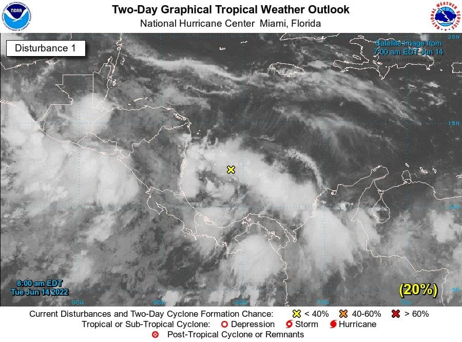 “La COEPROC informa que, con base en el Centro Nacional de Huracanes de Miami, Florida, Estados Unidos, y el Servicio Meteorológico Nacional, la zona de baja presión localizada sobre el suroeste del mar Caribe, aumentó de 10 a 20 por ciento la probabilidad de evolucionar en un sistema ciclónico en 48 horas; y se mantiene en 40 por ciento en cinco días”, detalló la dependencia.