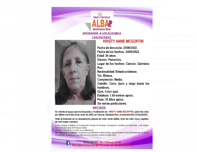 La Fiscalía de Quintana Roo activó los protocolos de búsqueda para localizar a la estadounidense Kristy Anne Mcgoffin, quien fue vista por última vez el viernes 24 de junio en la delegación Alfredo V. Bonfil, en Cancún.