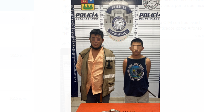 Policías de la Secretaría de Seguridad Pública y Tránsito Municipal de Solidaridad aseguraron a dos sujetos en posesión de un arma de fuego, señalados de disparar contra un domicilio en la colonia Gonzalo Guerrero.