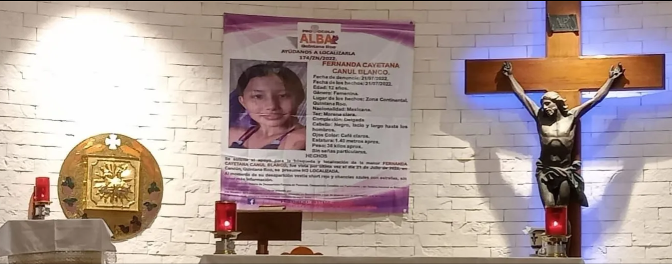 Fernanda Cayetana Canul Blanco cumplió 13 años de edad el lunes 5 de septiembre, pero lleva más de un mes desaparecida. Fue vista por última vez en la Zona Continental de Isla Mujeres el pasado 21 de julio, en la casa de su vecino Marco Antonio Cauich, donde trabajaba lavando platos y sacando la basura; únicamente laboró 4 días antes de su desaparición.