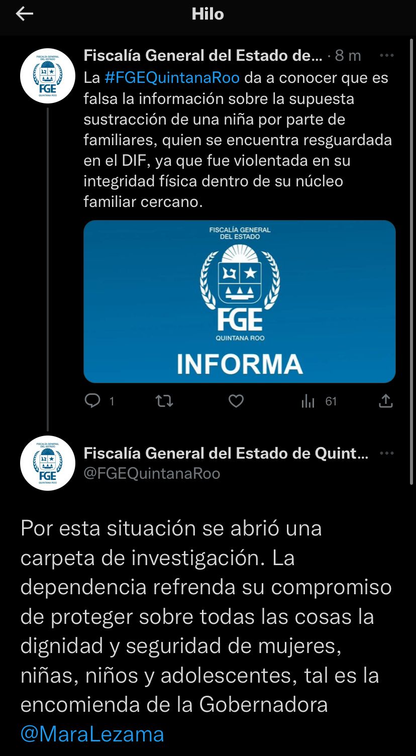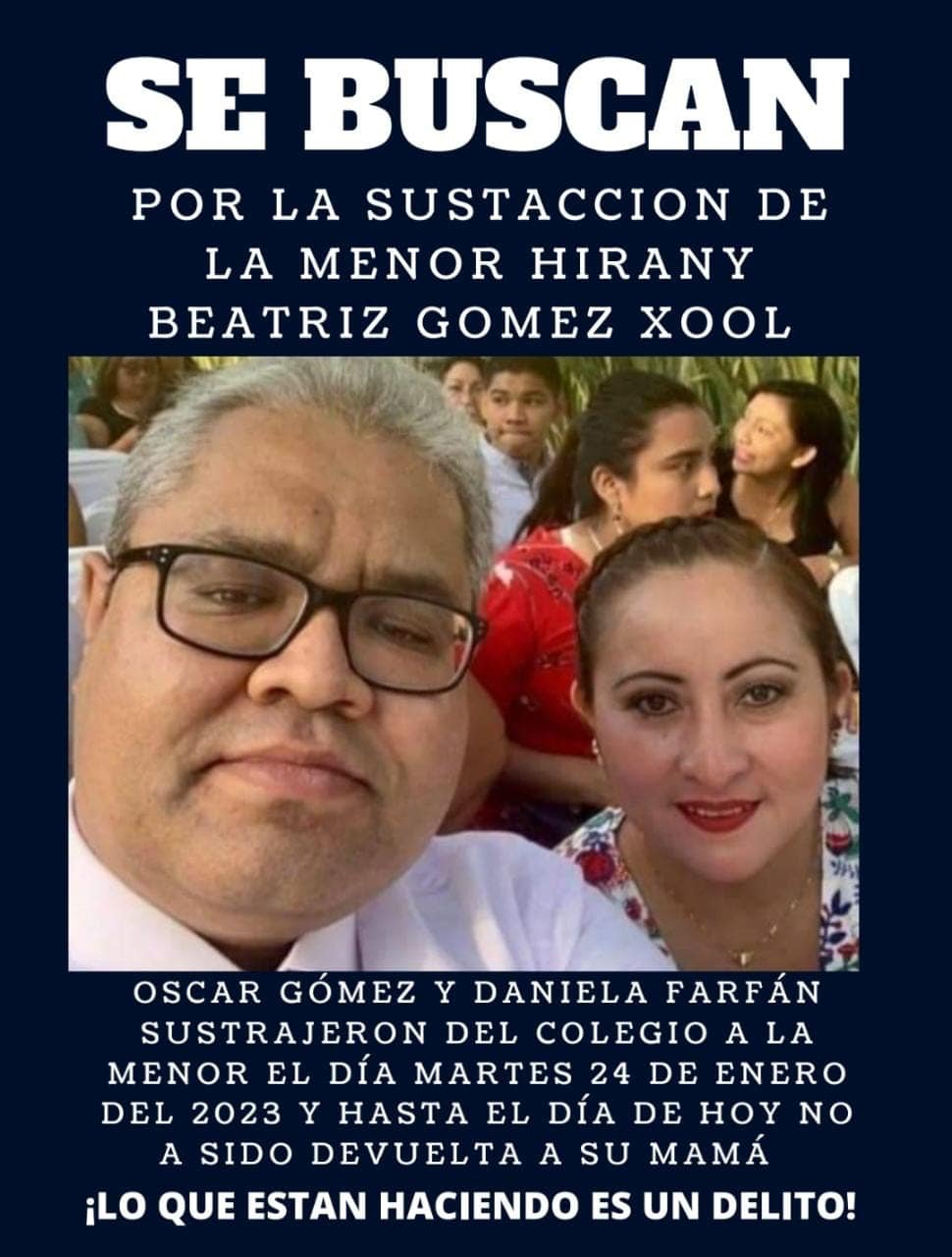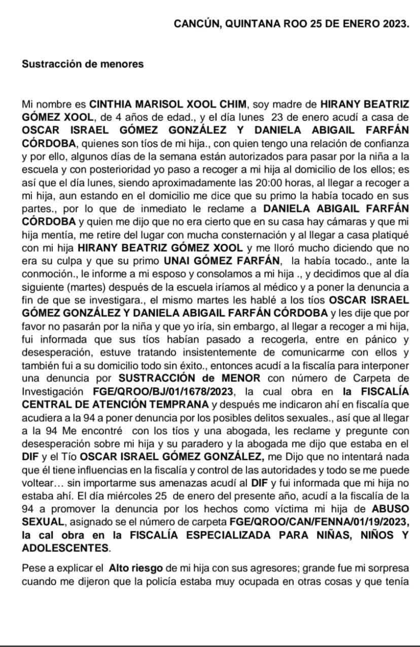 A través de redes sociales hace unos días se dio a conocer que Cinthia Xool Chim, mamá de la menor Hirany Beatriz, denunció la sustracción de su hija por parte de sus tíos Oscar Israel “N” y Daniela Abigail “N”, ya que presuntamente el hijo de éstos últimos la había violentado sexualmente, sin embargo la investigación dio un giro ya que al parecer el abuso fue cometido por su padrastro y hermanastro.