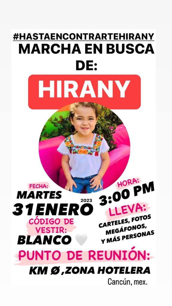 Es importante señalar que Cinthia convocó a una marcha en busca de Hirany para este martes 31 de enero a las 3:00 de la tarde, en el kilómetro 0 de la zona hotelera, con el lema #HastaEncontrarteHirany, pero ya las autoridades confirmaron que la tienen bajo resguardo.