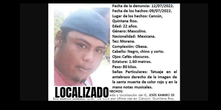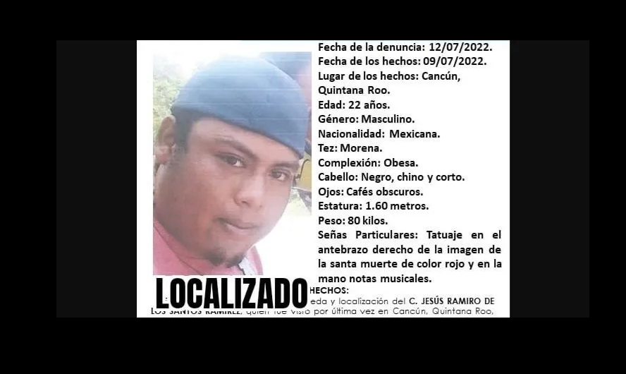 La Fiscalía General del Estado (FGE) de Quintana Roo, desactivó la ficha de búsqueda de un joven identificado como Jesús Ramiro de los Santos Ramírez, de 22 años de edad, quien fue visto por última vez el pasado 9 de julio en Cancún.