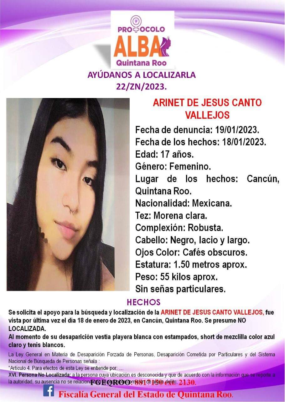Arinet de Jesús Canto Vallejos de 17 años fue visto por última vez por sus familiares el pasado 18 de enero de 2023 en Cancún, Quintana Roo.