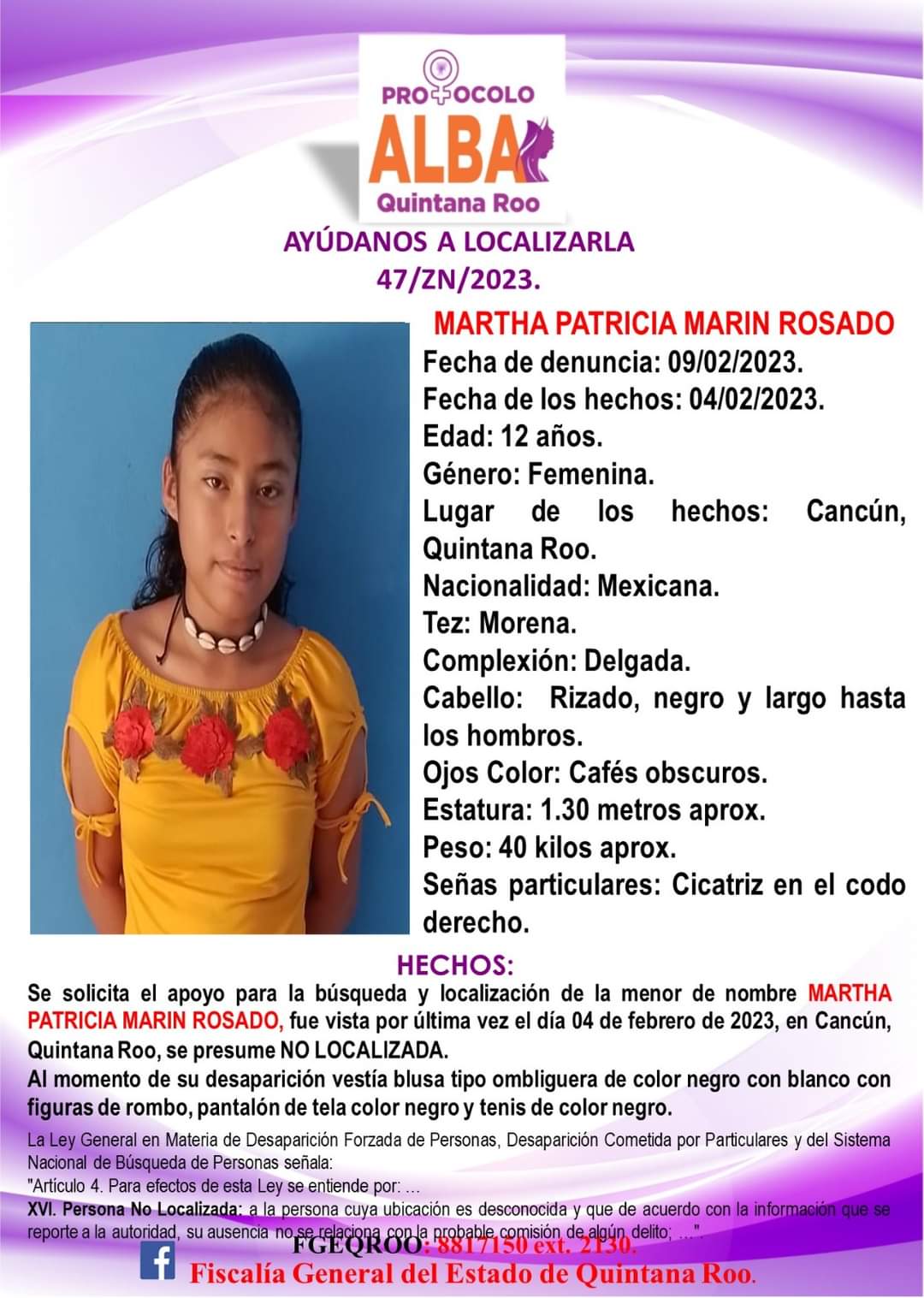 Martha Patricia Marín Rosado de 14 años fue vista por última vez por sus familiares el pasado 4 de febrero de 2023 en Cancún, Quintana Roo.