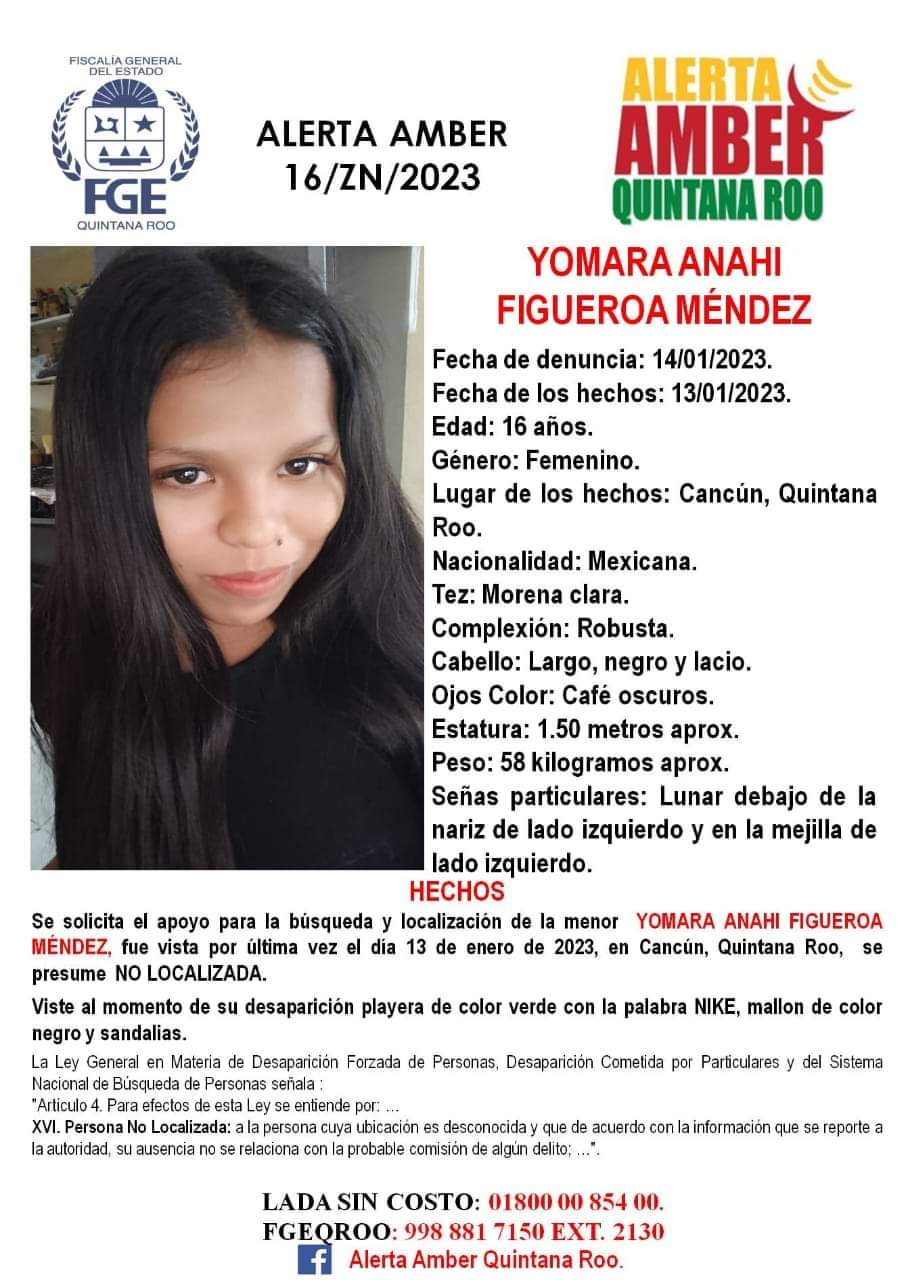 Yomara Anahí Figueroa Méndez de 16 años fue vista por última vez por sus familiares el pasado 13 de enero de 2023 en Cancún, Quintana Roo.