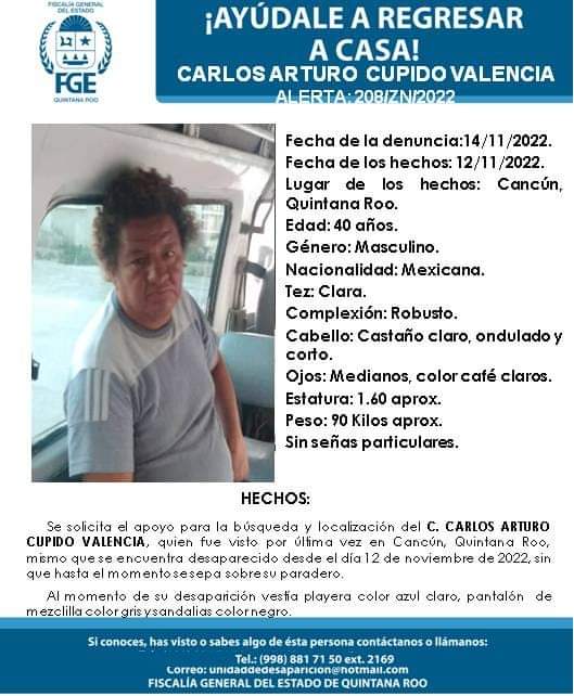 Carlos Arturo Cupido Valencia de 40 años fue visto por última vez por sus familiares el pasado sábado 12 de noviembre de 2022 en Cancún, Quintana Roo.