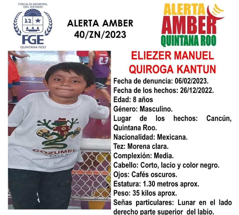 Eliezer Manuel Quiroga Kantún de 8 años fue vista por última vez por sus familiares el pasado 26 de diciembre de 2022 en Cancún, Quintana Roo.