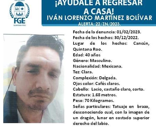 Iván Lorenzo Martínez Bolívar de 40 años fue visto por última vez por sus familiares el pasado 30 de diciembre de 2022 en Cancún, Quintana Roo.