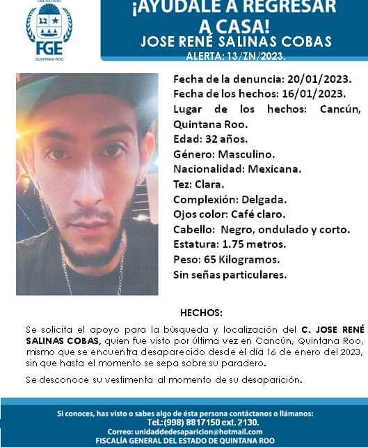 José René Salinas Cobas de 32 años fue visto por última vez por sus familiares el pasado 16 de enero de 2023 en Cancún, Quintana Roo.