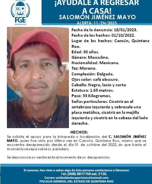 Salomón Jiménez Mayo de 30 años fue visto por última vez por sus familiares el pasado 1 de octubre de 2022 en Cancún, Quintana Roo.
