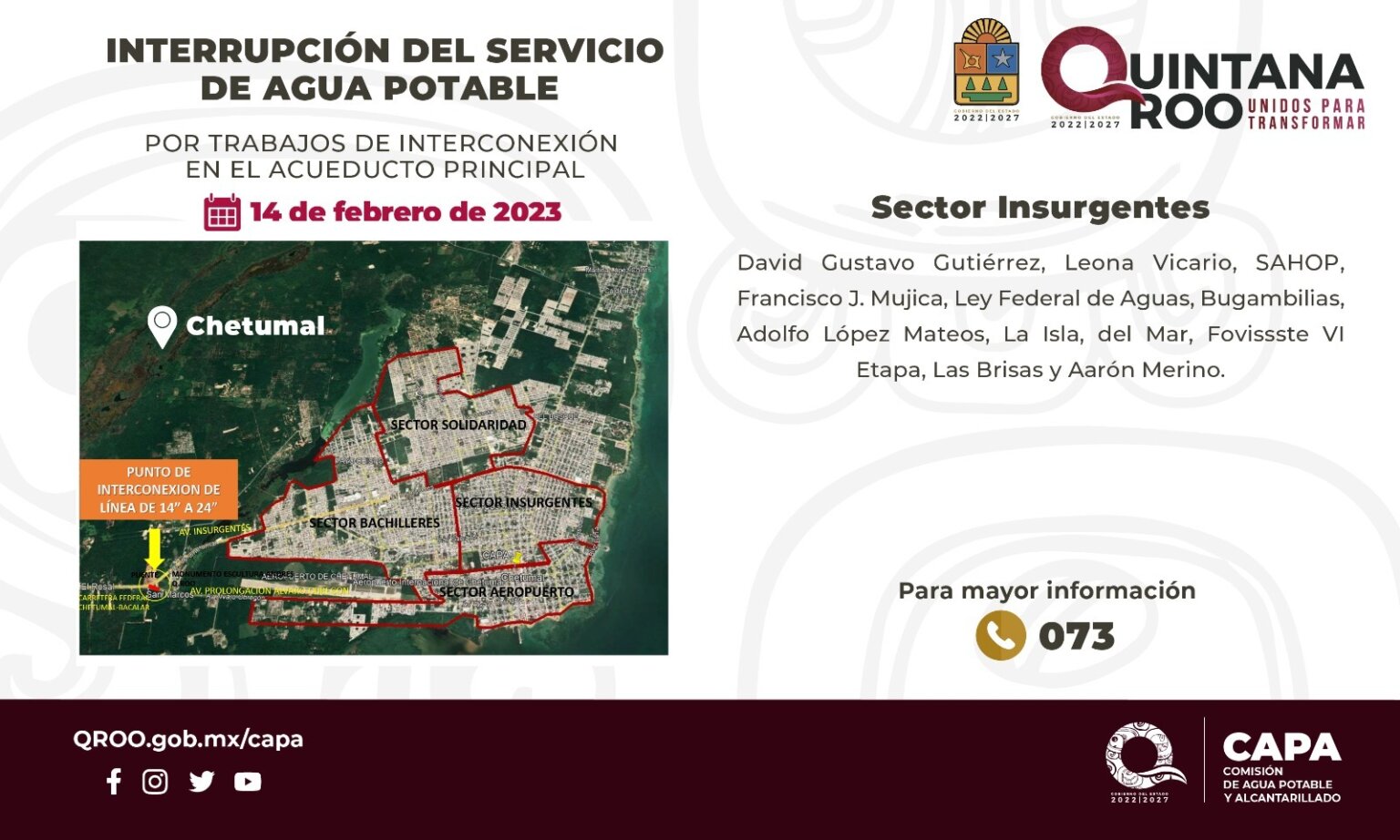 La Comisión de Agua Potable y Alcantarillado (CAPA) informó que se realizarán trabajos de interconexión de tuberías en el acueducto principal de la ciudad de Chetumal, lo que ocasionará la interrupción del servicio de agua potable el próximo 14 de febrero, al tiempo que se hace un llamado la población de los sectores Aeropuerto, Bachilleres, Insurgentes y Solidaridad, para tomar las previsiones necesarias para un período estimado de 36 a 48 horas.