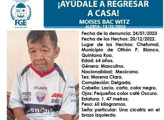 Moisés Bac Witz de 64 años fue visto por última vez por sus familiares el pasado 20 de diciembre de 2022 en Chetumal, Quintana Roo.