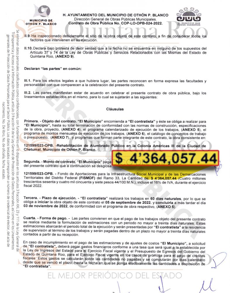 Los anterior consta en el contrato COP-LO-OPB-024-2022 cuyo objeto es, como se dijo líneas arriba, la rehabilitación de alumbrado público en el fraccionamiento Américas III que fue firmado el 31 de agosto de 2022 y tuvo fecha de inicio el 5 de octubre de 2022 y supuestamente finalizó el 3 de noviembre de 2022.