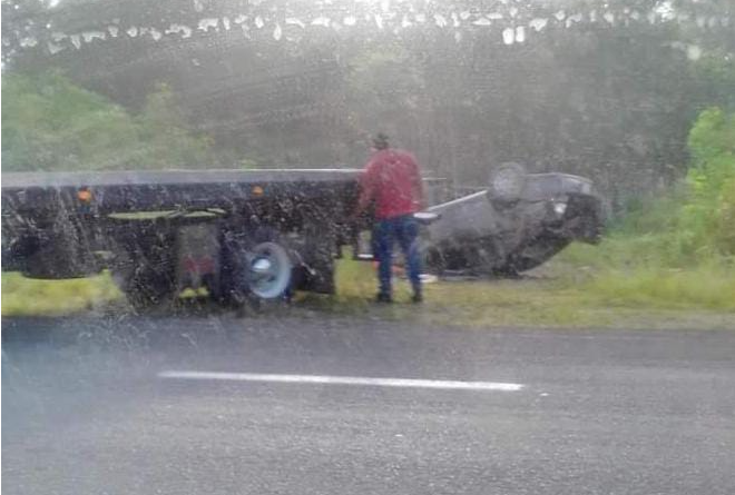 El accidente se suscitó frente al hotel Akalkí, en el kilómetro 12 de esta vía federal, cuando este Volkswagen Jetta gris se salió de la cinta asfáltica, para luego volcarse y acabar en posición invertida, a un costado de la carretera.