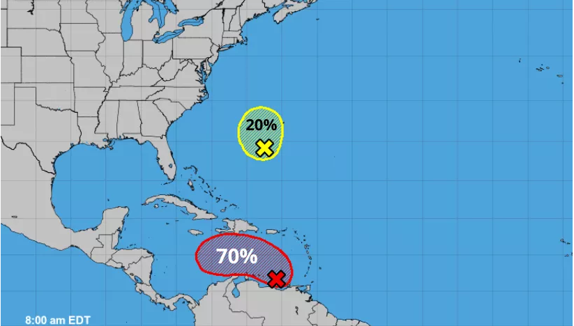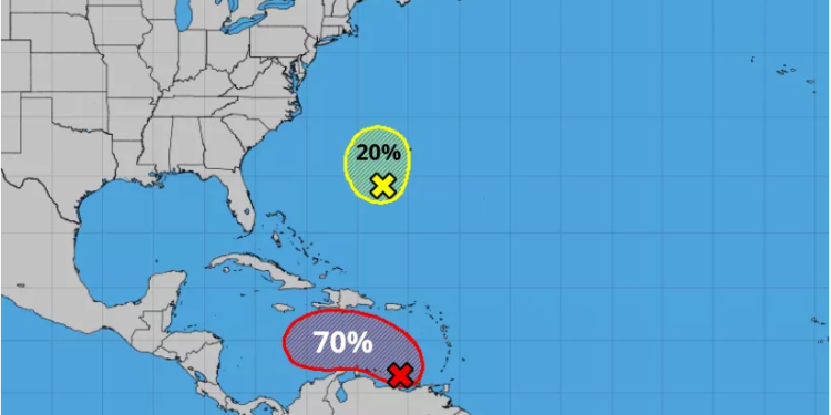 No obstante, la segunda zona de baja presión que se ha desarrollado sobre el este del Mar Caribe, presenta 20% de probabilidad para desarrollo ciclónico en 48 horas y 70% de probabilidad para desarrollo ciclónico en 5 días.
