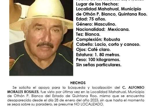 Alfonso Morales Rosales de 75 años fue visto por última vez por sus familiares el pasado 28 de enero de 2023 en Mahahual, localidad del Mpio. Othón P. Blanco, Quintana Roo.