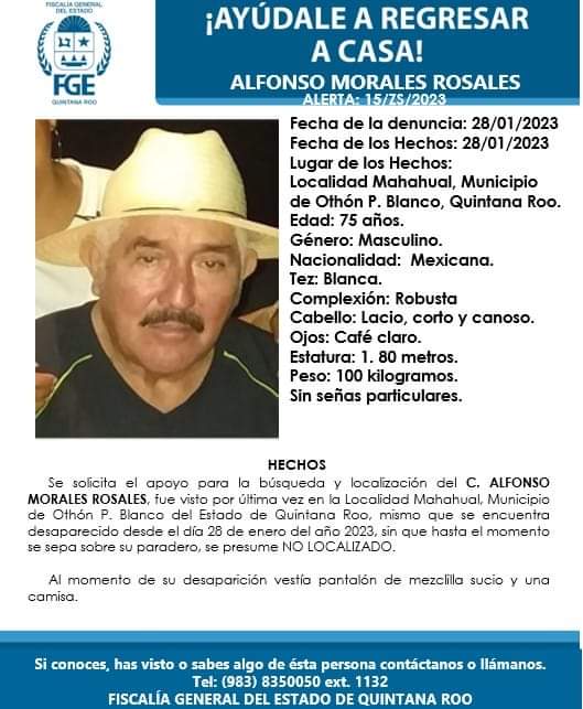 Alfonso Morales Rosales de 75 años fue visto por última vez por sus familiares el pasado 28 de enero de 2023 en Mahahual, localidad del Mpio. Othón P. Blanco, Quintana Roo.