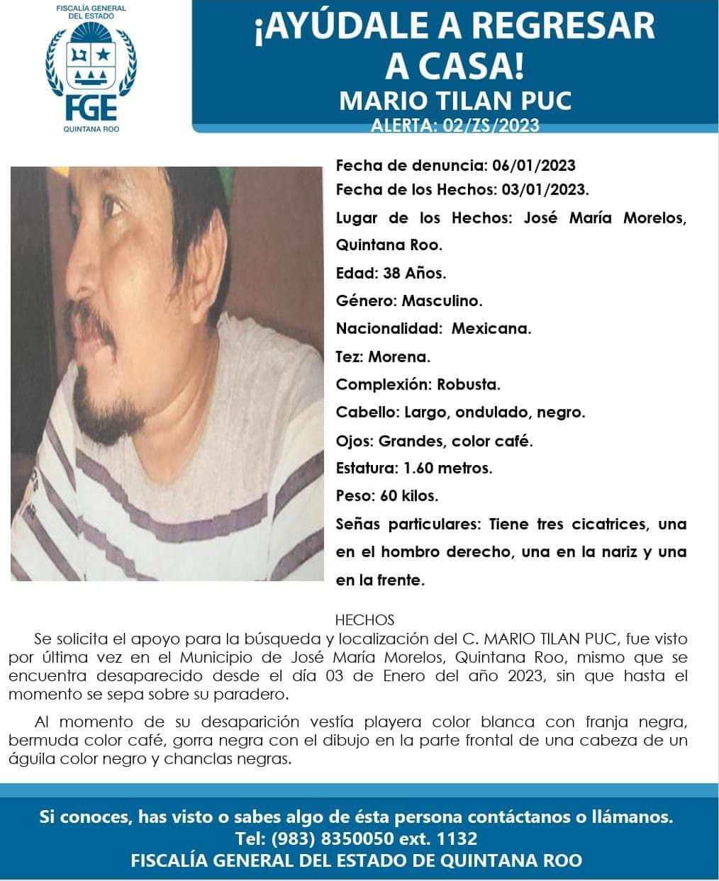 Mario Tilan Puc de 38 años fue visto por última vez por su familia el pasado 3 de enero de 2023 en José María Morelos en Quintana Roo.