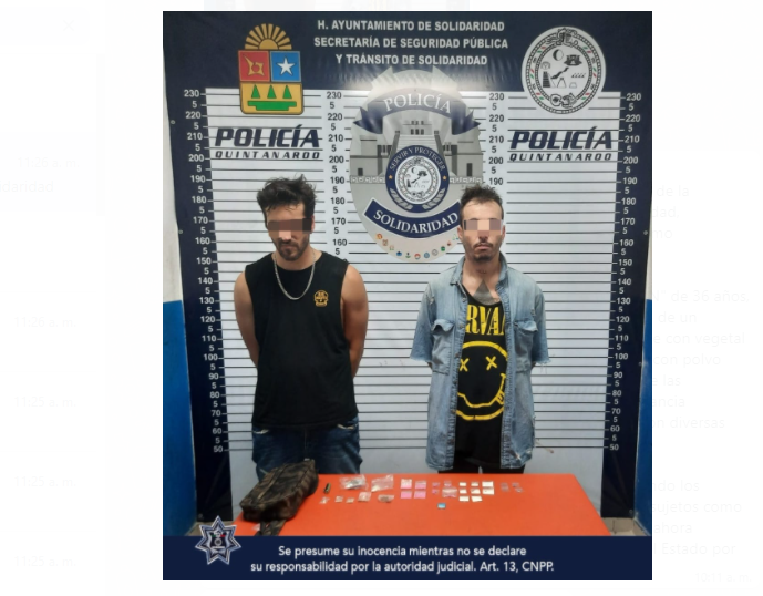 Policías de la Secretaría de Seguridad Pública y Tránsito Municipal de Solidaridad, aseguraron a dos sujetos en posesión de posibles narcóticos como marihuana, cocaína, LSD, cristal y crack.