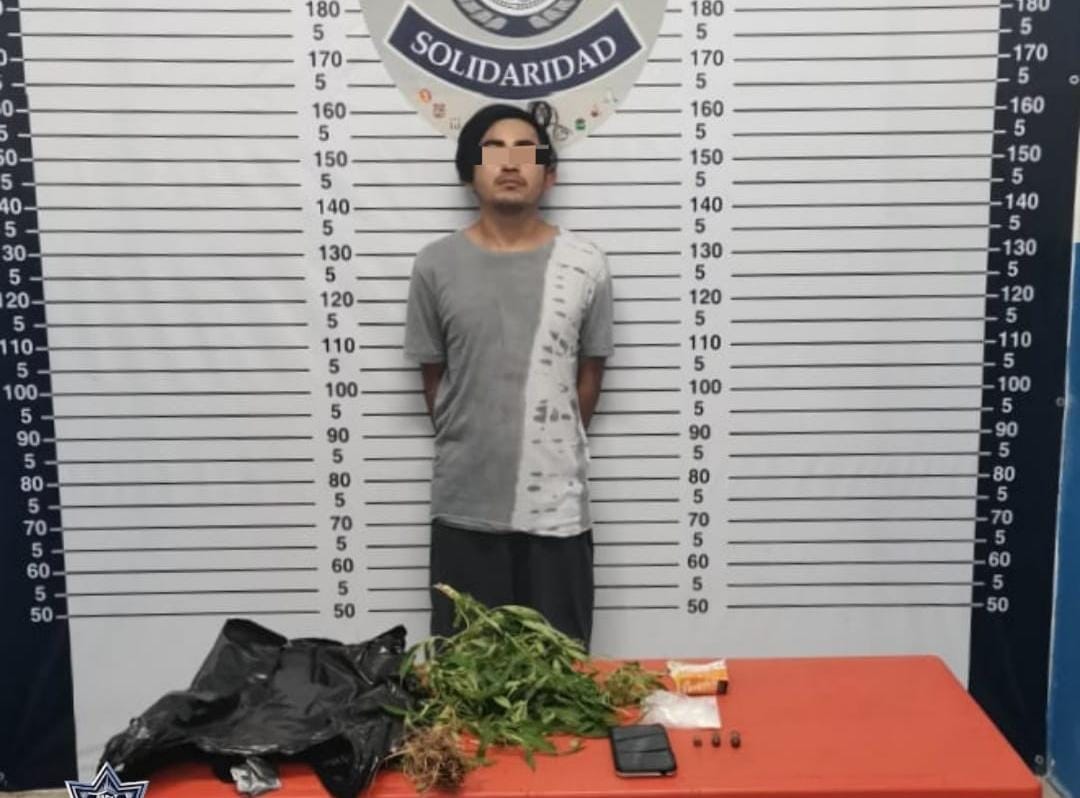 Una persona fue asegurada en posesión de narcóticos y cartuchos por policías de la Secretaría de Seguridad Pública y Tránsito Municipal de Solidaridad, en el fraccionamiento Villas del Sol.