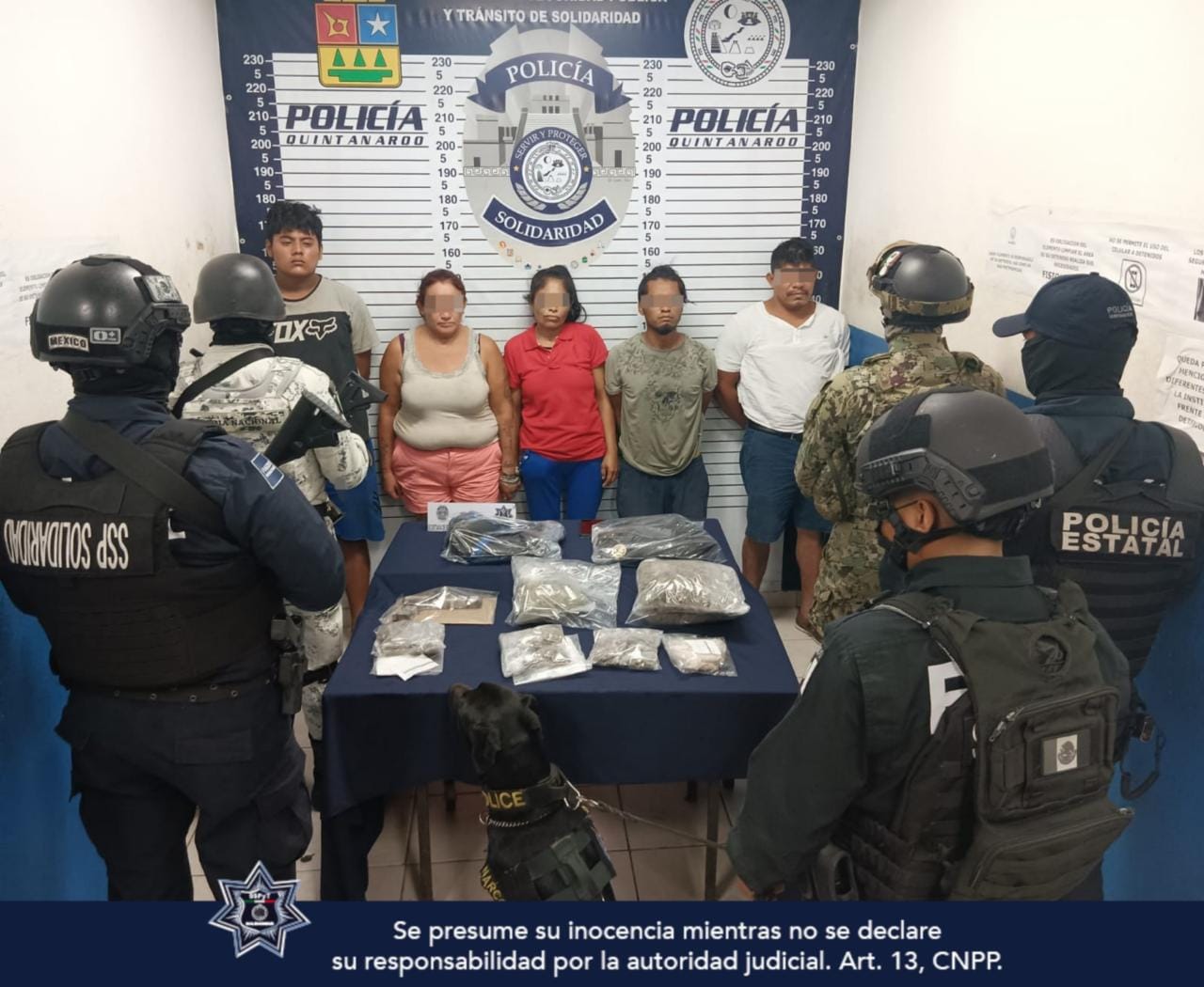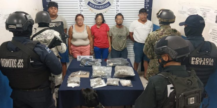 Policías y la Unidad Canina de la Secretaría de Seguridad Pública y Tránsito Municipal de Solidaridad, así como elementos de la Guardia Nacional, Marina y Policía Quintana Roo, aseguraron a 5 personas, un arma de fuego hechiza, y posible droga con las características de la marihuana y cristal, en la colonia Bellavista.