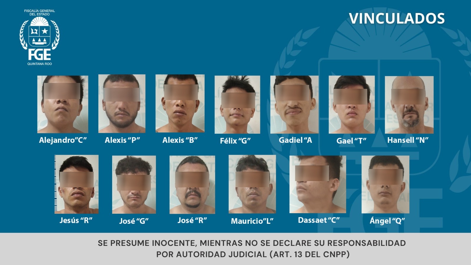 Los vinculados son: Mauricio “L”, José “G”, José “R”, Gadiel “A”, Jesús “R”, Félix “G”, Alexis “P”, Alejandro “C”, Alexis “B”, Ángel “Q”, Hansell ”N”, Dassaet “C” y Gael “T”.