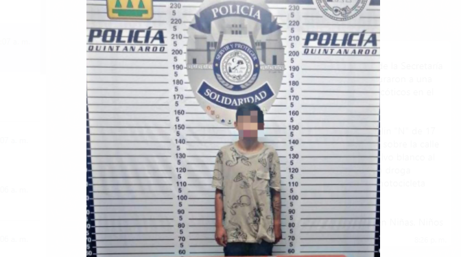 El menor identificado como Víctor “N”, originario del estado de Quintana Roo, fue asegurado la tarde de hoy 3 de marzo sobre la avenida Constituyentes con calle Flor de Acanto, luego de que intentara darse a la fuga a bordo de una motocicleta de la marca Itálika, color negro al ser sorprendido por los oficiales manipulando una bolsa que contenía un vegetal verde similar a la marihuana.