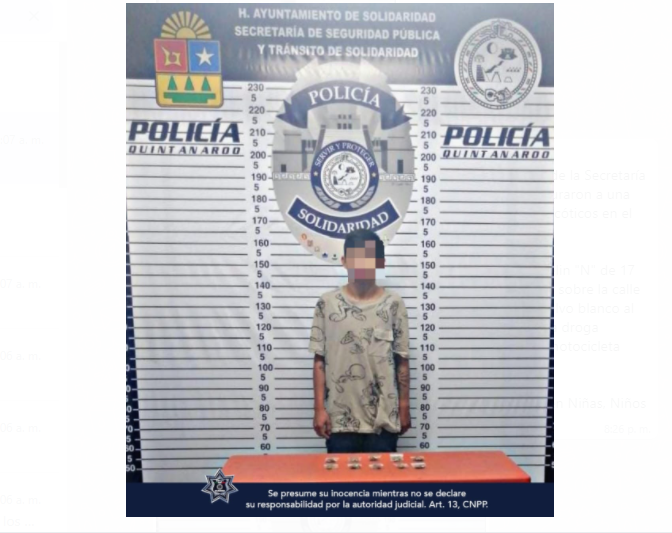 El primero es un menor de 16 años de edad, fue asegurado en posesión de 12 bolsas con posibles narcóticos, por policías de la Secretaría de Seguridad Pública y Tránsito Municipal de Solidaridad en la colonia Gonzalo Guerrero.