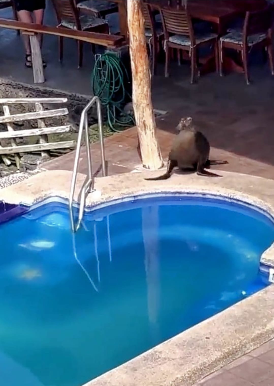 Acto seguido, sale de la piscina y se dirige hacia unos camastros, tomando por sorpresa al hombre que se encontraba sentado en uno de ellos, quien al ver que el animal se dirigía hacia su camastro, no le quedó de otra más que tomar su toalla y permitir al lobo marino que se recostara a tomar el sol.