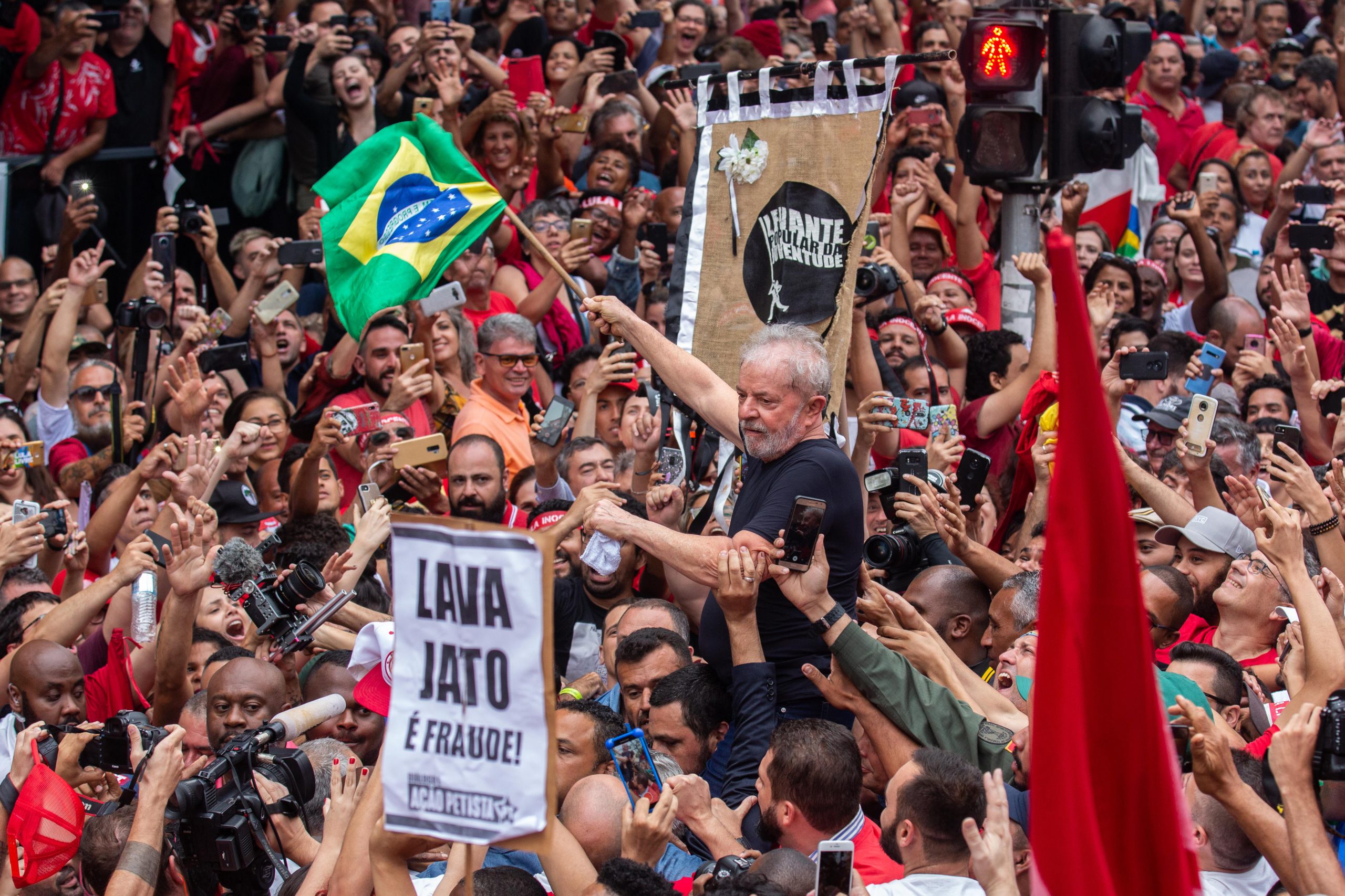 09 November 2019, Brazil, Sao Paulo: Former Brazilian President Lula da Silva (C) takes part in demonstration at the Metallurgists Union a day after being released from prison, after 580 days in jail, following a supreme court decision that determined defendants can remain free until they have exhausted all appeals. On 12 July 2017, Lula was convicted of money laundering and passive corruption, and was sentenced to nine years and six months. Photo: Paulo Lopes/ZUMA Wire/dpa 09/11/2019 ONLY FOR USE IN SPAIN