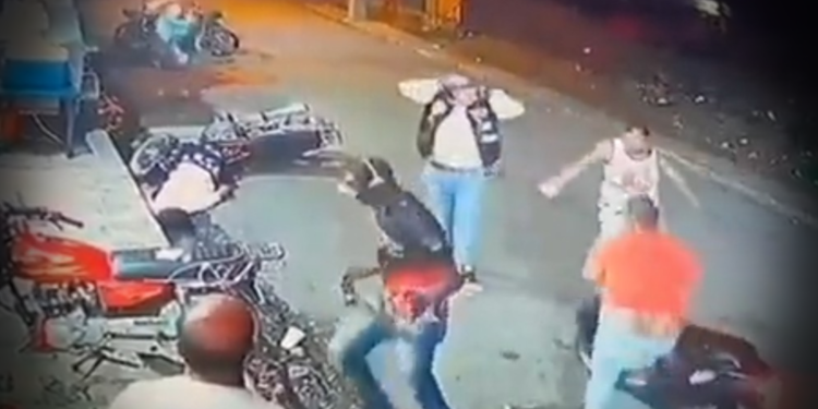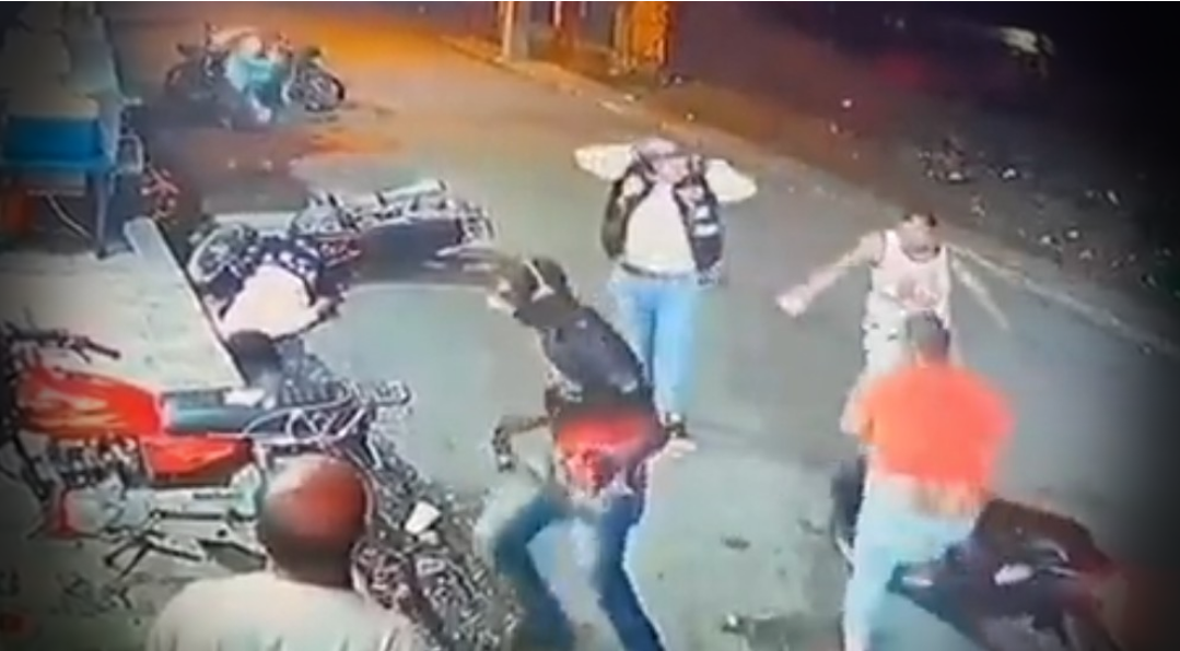 Herido, el cómplice se desploma de la motocicleta y queda tirado sobre la calle, mientras que el hombre quién disparo rápido esconde el arma colocándola dentro de sus bermudas intenta hacerse el desentendido.