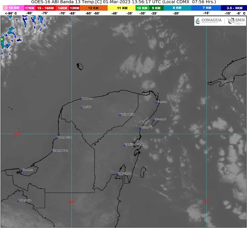 Con base en la sinopsis del Servicio Meteorológico Nacional (SMN), la afluencia de aire marítimo principalmente del Mar Caribe hacia la región peninsular, ocasionará ambiente matutino templado y muy caluroso por la tarde, cielo parcialmente nublado con incremento de nublados en el transcurso del día, con probabilidad de lluvias aisladas sobre algunas zonas de Quintana Roo.