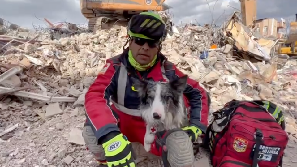 El rescatista de la Cruz Roja Mexicana, Edgar Martínez y el perrito Balam aparece en las imágenes que compartió el Secretario de Relaciones Exteriores, Marcelo Ebrard.