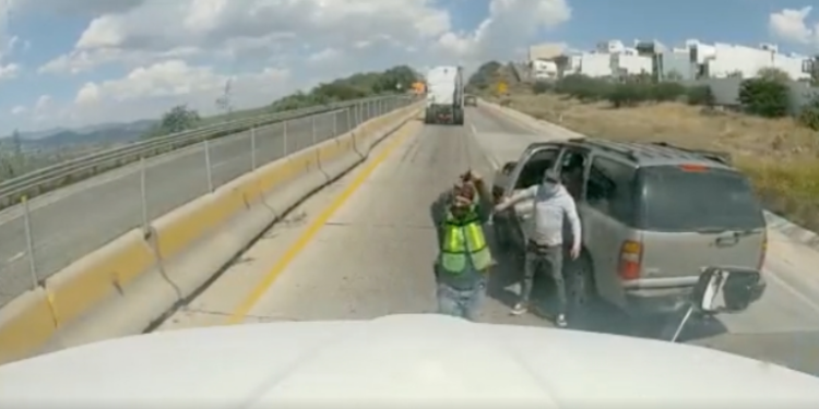 Este video que ya se hace circular en redes sociales, muestra el momento exacto en el que los dos hombres que van en la cabina del tráiler comienzan a preocuparse alber qué vehículos se les acercan.