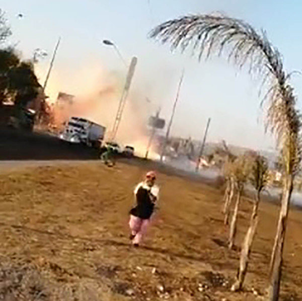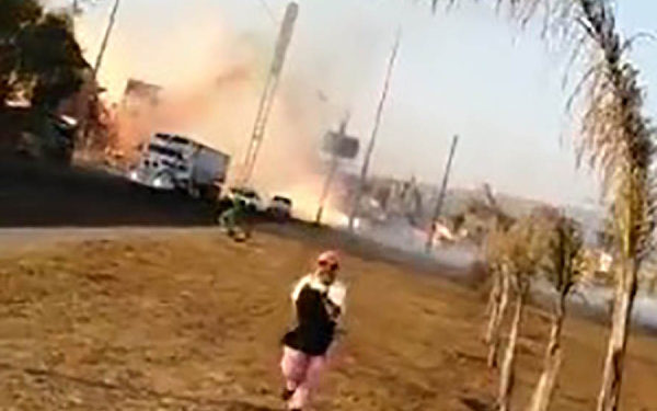 Repentinamente se escucha una gran explosión y comienza a surgir una nube de fuego.  La persona que graba este video grita y comienza a correr en sentido contrario.