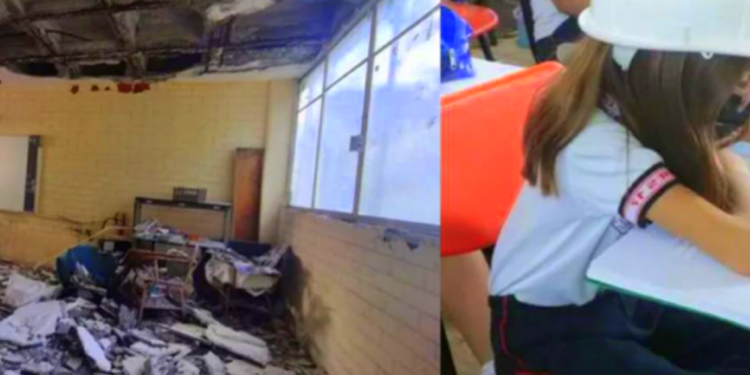 Niños toman clases con casco puesto ante el riesgo de que colapse el techoEl temor de los estudiantes de sus padres y de la escuela de que se colapse alguno de los techos se debe a que estuvo lloviendo mucho durante varios días y algunas paredes se encuentran reblandecidas.
