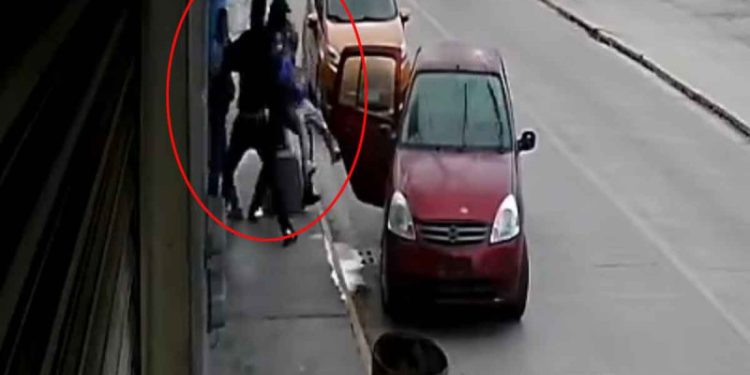 En un video captado por cámaras de videovigilancia de un local comercial se observa el momento en el que los hombres descendieron de un vehículo color rojo y comenzaron a amagar a las víctimas.