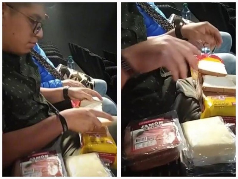 En los cines venden muchas botanas y dulces, pero a veces no es suficiente para calmar el antojo; no obstante, aunque no está permitido, hay quienes burlan la seguridad hasta para meter a la sala jamón, queso, pan, para hacer y degustar unos deliciosos sándwiches.