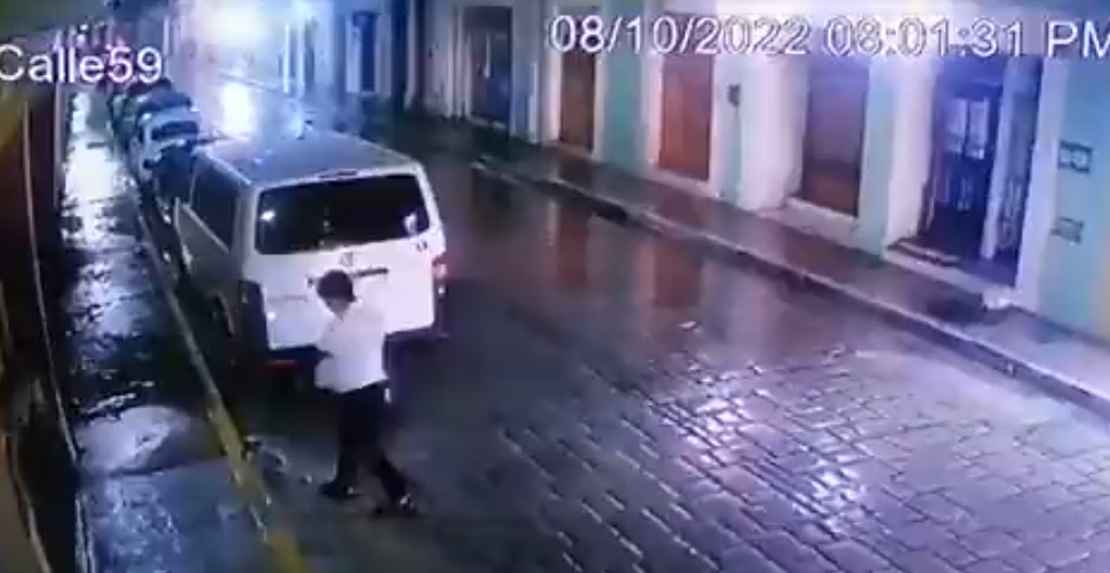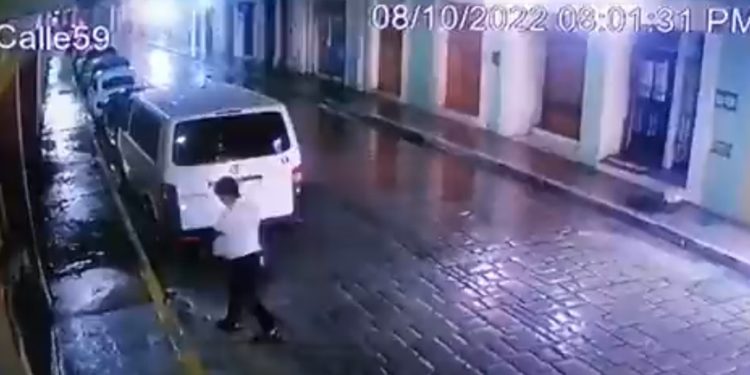 Las imágenes que ya circulan en redes sociales muestran a un hombre que camina en una de las calles del centro histórico de Campeche, durante una lluviosa noche.