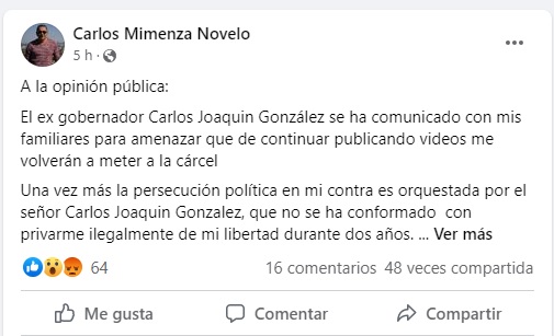 “El ex gobernador Carlos Joaquín González se ha comunicado con mis familiares para amenazar que de continuar publicando videos me volverán a meter a la cárcel