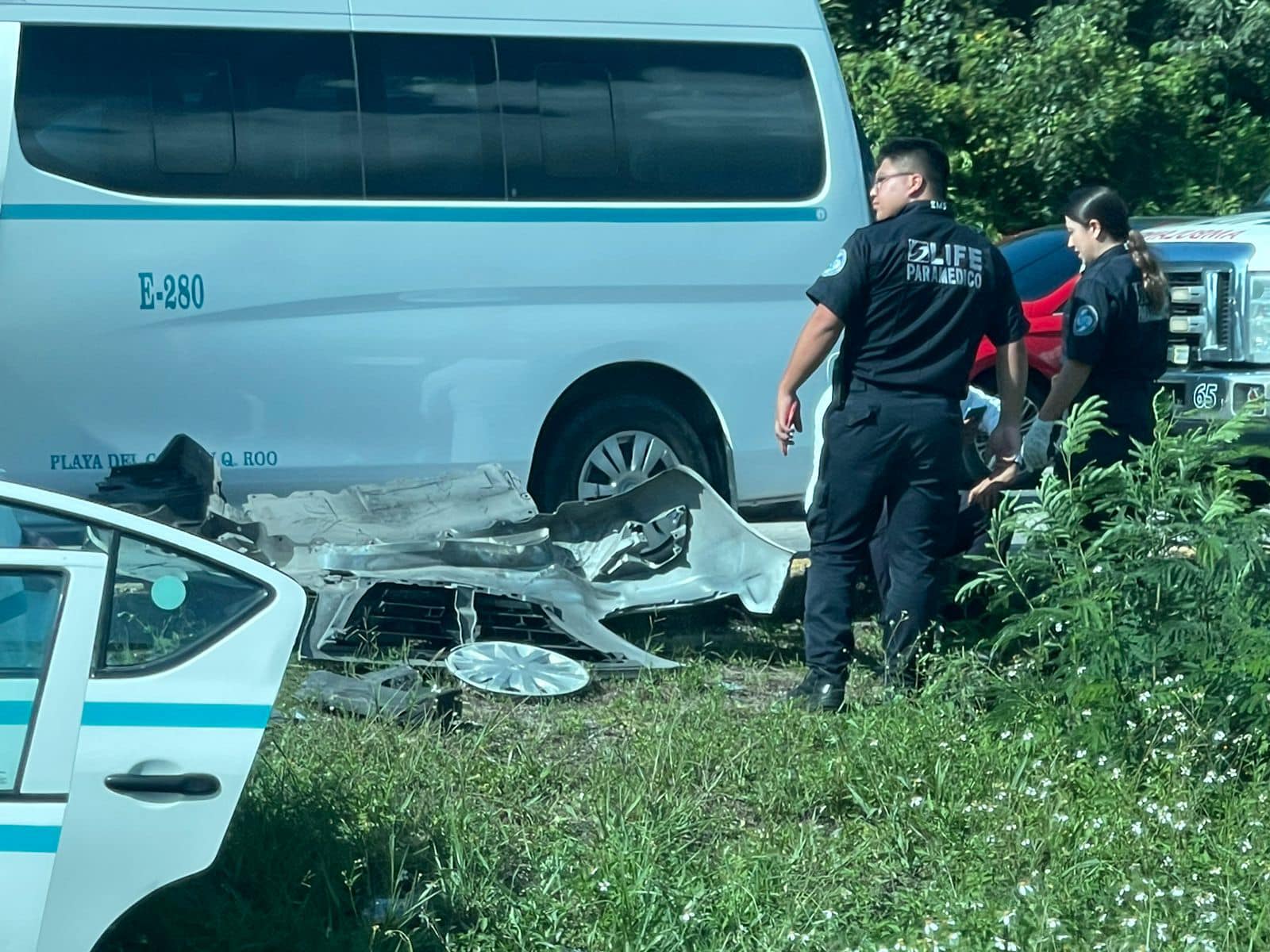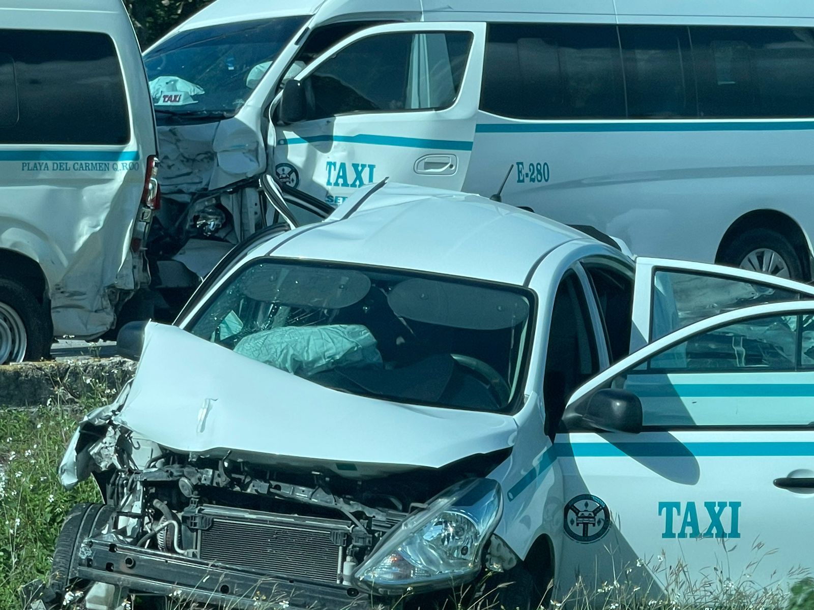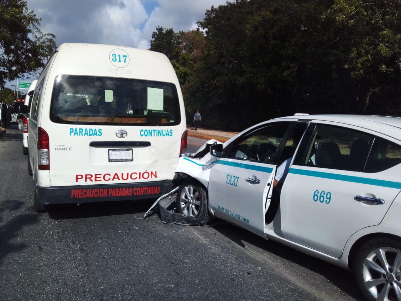 Más tarde otro accidente se suscitó sobre la Carretera Federal, en el tramo Playa del Carmen-Puerto Morelos, donde un taxi y varias vans del transporte público provocaron cuantiosos daños materiales, se reportaron a varias personas lesionadas, al lugar llegaron unidades de emergencias en auxilio de las personas heridas.