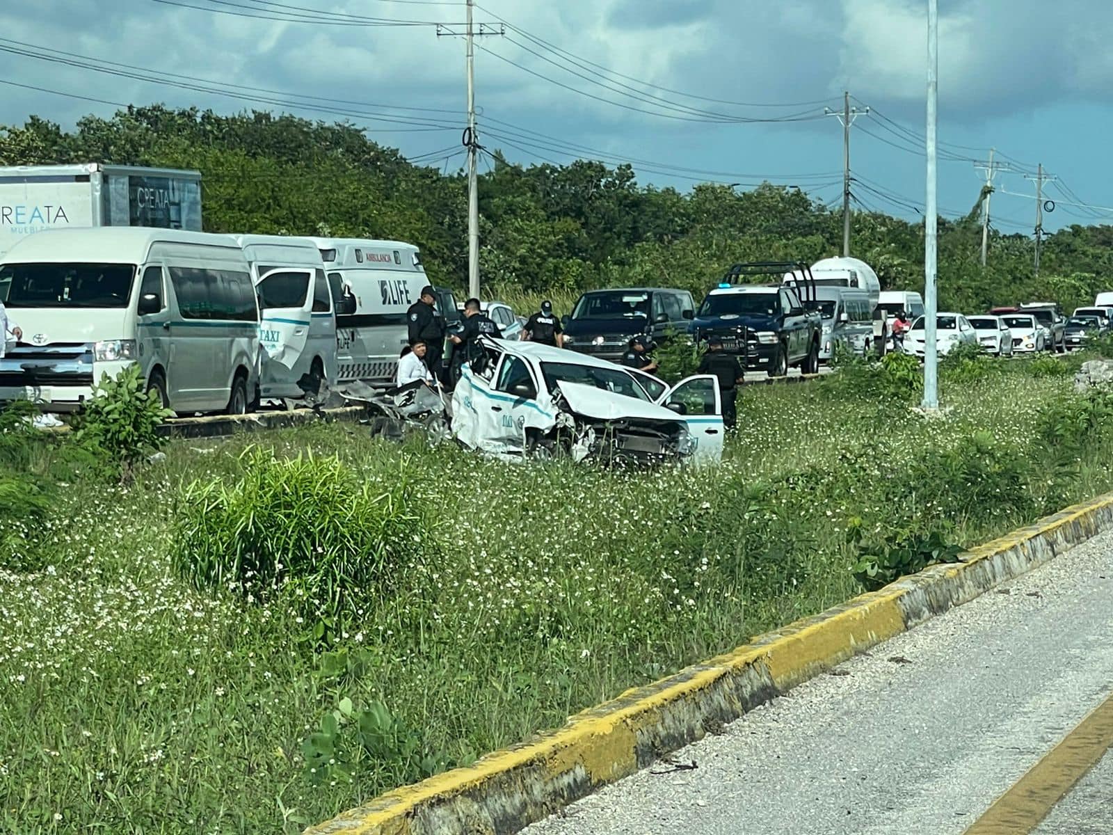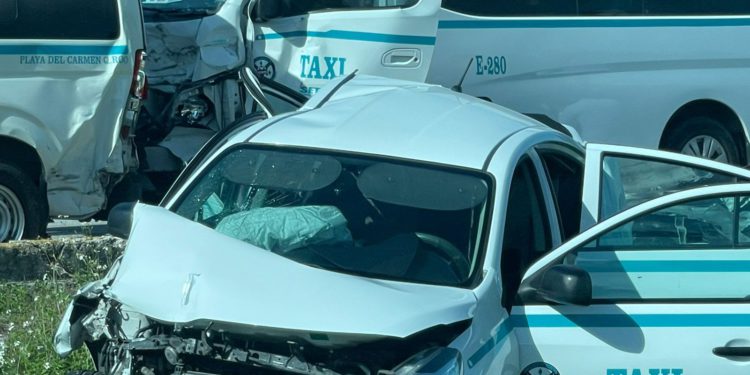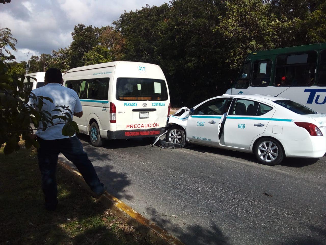 Más tarde otro accidente se suscitó sobre la Carretera Federal, en el tramo Playa del Carmen-Puerto Morelos, donde un taxi y varias vans del transporte público provocaron cuantiosos daños materiales, se reportaron a varias personas lesionadas, al lugar llegaron unidades de emergencias en auxilio de las personas heridas.