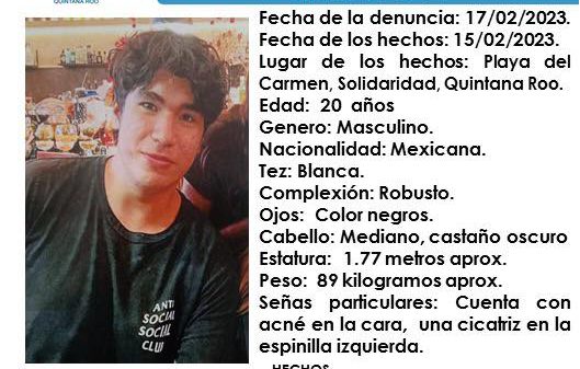 La Fiscalía General del Estado de Quintana Roo activo la ficha de búsqueda del joven de 20 años, Bryan Abraham Galeana Sánchez, de quien no se tiene información de su paradero desde el pasado 15 de febrero de 2023 en el municipio de Solidaridad.
