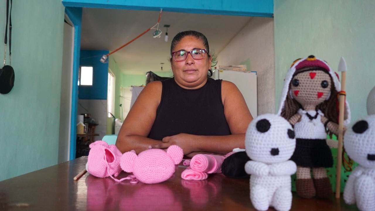 La emprendedora local y artesana, Blanca del Carmen López, es una de las decenas de personas beneficiadas por el Mercadito Vecinal del Gobierno de Solidaridad; su negocio consiste en crear muñecos tejidos a mano de diversos personajes reconocidos.